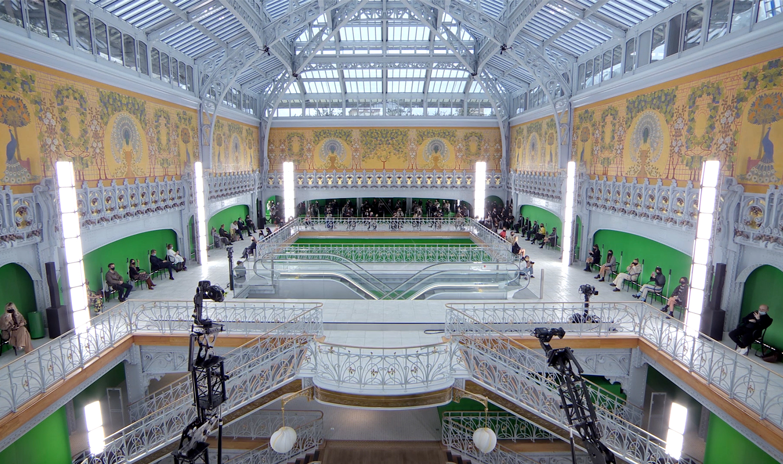 Le défilé s’est tenu sous la grande verrière de la Samaritaine, monument historique à l’architecture Art Déco et aux fresques Art Nouveau. Des panneaux verts géants servent à incruster digitalement des scènes du film de Wim Wenders « Les Ailes du désir » que seule l’audience connectée peut voir.